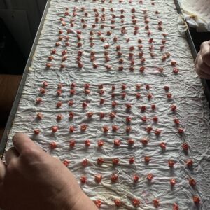 After aligning the individual seeds in rows and columns, we cover with paper towels and then moisten daily. The seeds are then nestled under a warm blanket to create cozy dark growing conditions that mimic their life in the soil. Three days later we count the sprouted kernels and enter the data into a spreadsheet to give us our average germ.